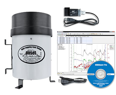 由Onset公司生产的HOBO 自记录雨量计 RG3-M 自带一个HOBO Pendant(UA-003-64)事件/温度记录仪,由纽扣式锂电池供电,可独立工作。采集器的内存可存储大约16000组数据。该系统可通过内部的翻斗式雨量计自动记录 3200mm 的降雨数据,用于确定降雨量、降雨时间和降雨持续时间。仪器顶部配备有数据接口,用于下载数据。