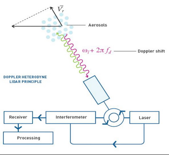 测风激光雷达是根据多普勒效应并采用外差分析法进行风速测量的仪器。激光器向大气中发射激光脉冲信号,脉冲传播过程中遇到运动中的悬浮颗粒物并产生多普勒频移现象,该频移量与颗粒物径向风速成一定比例关系。通过分析后向散射回波信号的中的频移量可计算径向风速风向,提供对流层中云层和气溶胶层定位和监测,输出大气边界层高度信息。