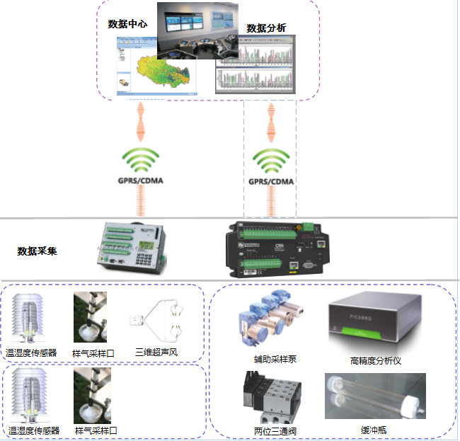Picarro 梯度通量观测系统包括样气采集及处理单元、温室气体分析单元、供电单元、控制单元、校准单元、数据采集、存储及传输单元以及系统安装附件。