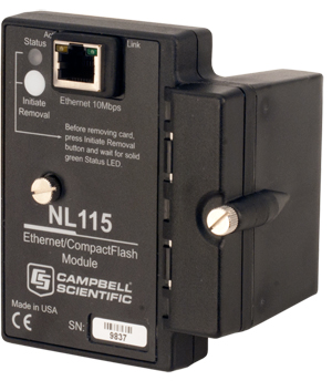 NL115自带闪存卡存储模块和10baseT以太网接口,既可以将观测数据存储到CF存储卡中,又能够利用TCP/IP协议,通过双绞线将数据采集器及整个观测系统接入局域网或公网,实现对观测系统的远程控制和观测数据的网络传输。它通过40针的外设端口连接到CR1000或CR3000数据采集器上的。