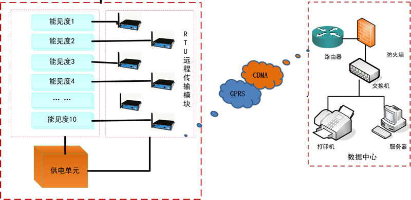 SVS120能见度观测系统配备的TR513型 RTU具有串口无线数传功能,采用透明传输或者简单协议传输方式,可以将串行设备的数据通过3G无线网络(支持联通、电信网络)传输给远端计算机。同时它还兼备了数据采集的功能,观测数据能保存在RTU的内存中,以保证无线网络中断期间的数据不会丢失。